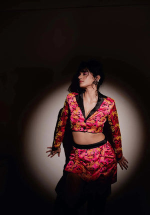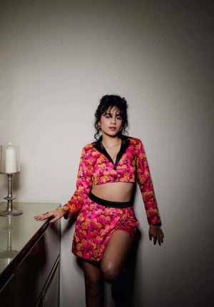 Immerse yourself in sophistication with our skort, adorned with a hand-embroidered flap and a sleek black satin waistband and lining. This digitally printed piece exudes elegance, offering a versatile and captivating addition to your wardrobe.